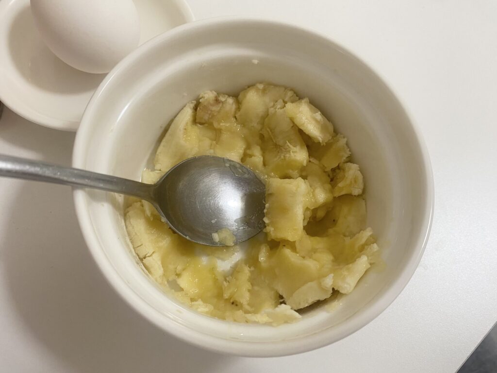 ①耐熱容器にバナナを入れてトロっとするまで潰し混ぜる