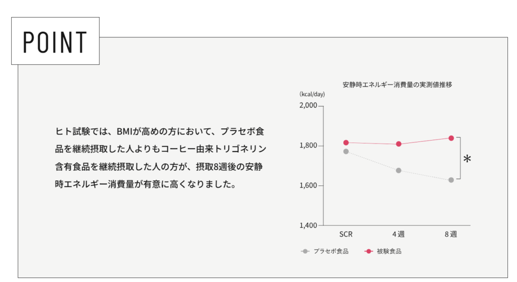 ヒト試験では、BMIが高めの方がトリゴネリンを継続して摂取すると、安静時のエネルギー消費量が高くなることが確認されています。
